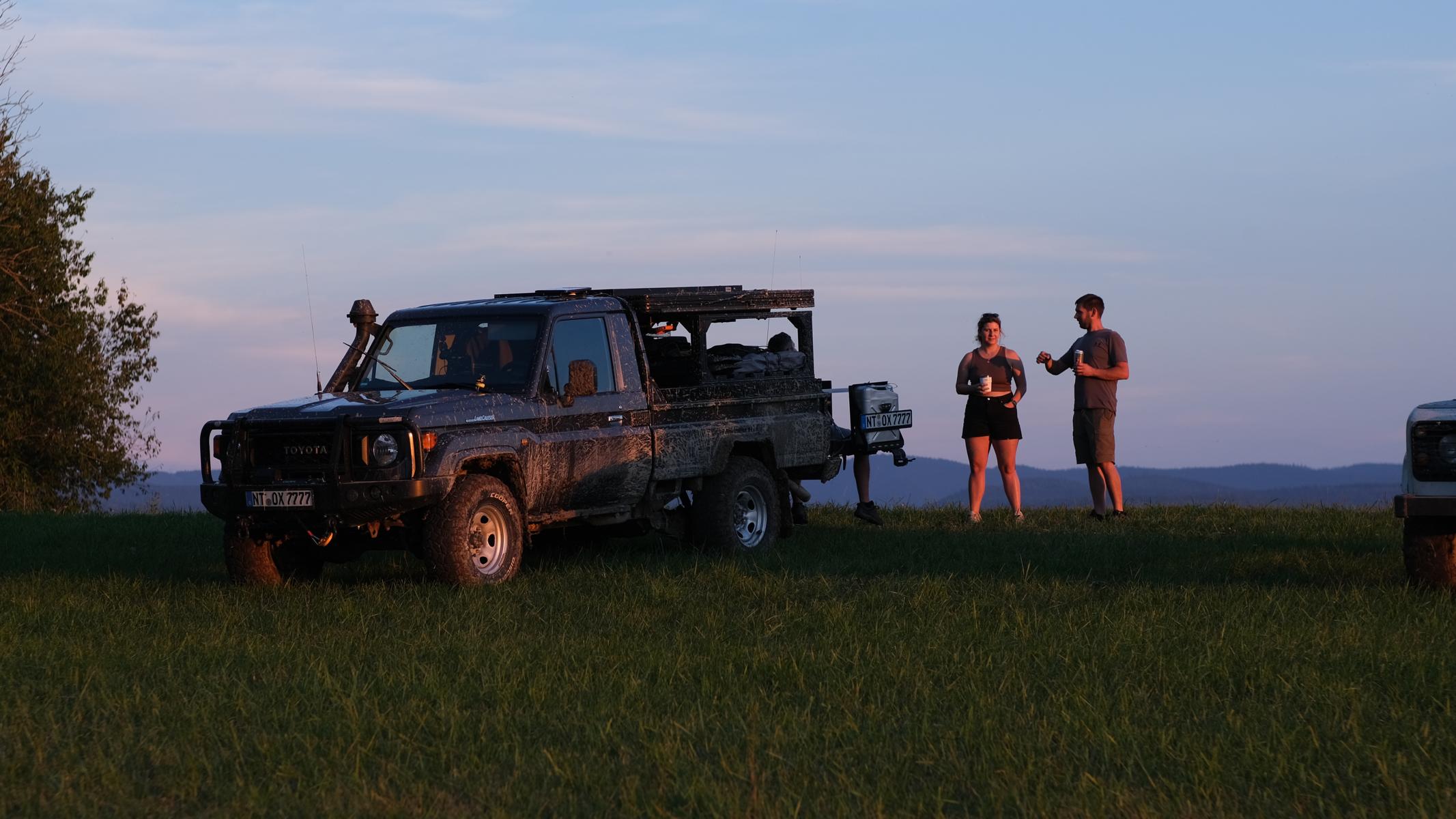Das Camp am Abend liegt abgelegen, eingebettet zwischen Wald und Weite. Kein Lärm, keine Zäune – nur Natur. Der Untergrund ist weich, teils sandig, ideal zum Aufstellen von Dachzelten oder Bodenzelten. Lagerfeuer ist – je nach Jahreszeit – erlaubt und wird zum Treffpunkt aller. Gekocht wird einfach: über dem Feuer, im Dutch Oven oder auf dem Gaskocher. Die Stimmung ist ruhig, kameradschaftlich – man tauscht Geschichten, schraubt vielleicht noch etwas am Fahrzeug oder genießt einfach nur den Moment.
