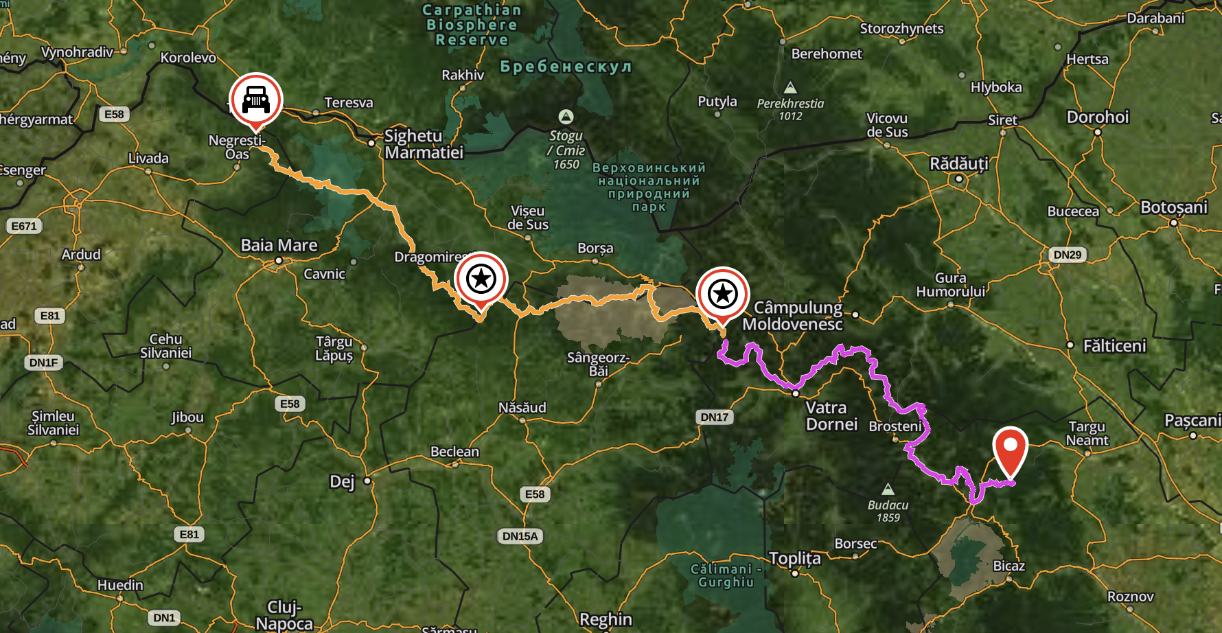 Da die Tour im Mai stattfindet, müssen wir mit sehr wechselhaftem Wetter rechnen. Frühling in den Karpaten heißt: in tieferen Lagen oft schon milde Temperaturen und erste Sonnenstunden, aber in den höheren Regionen kann noch Schnee liegen oder mit Schneeschmelze zu rechnen sein, die Wege matschig und Pfützen tief macht. Das Gelände kann sehr anspruchsvoll sein: ausgewaschene Waldwege, steile Anstiege auf losem Geröll, Rinnen und Gräben, Flussdurchfahrten, Morast, steile Serpentinen – alles, worin ein gut ausgerüsteter Geländewagen mit Allrad und Untersetzung seine Stärken ausspielen kann.
