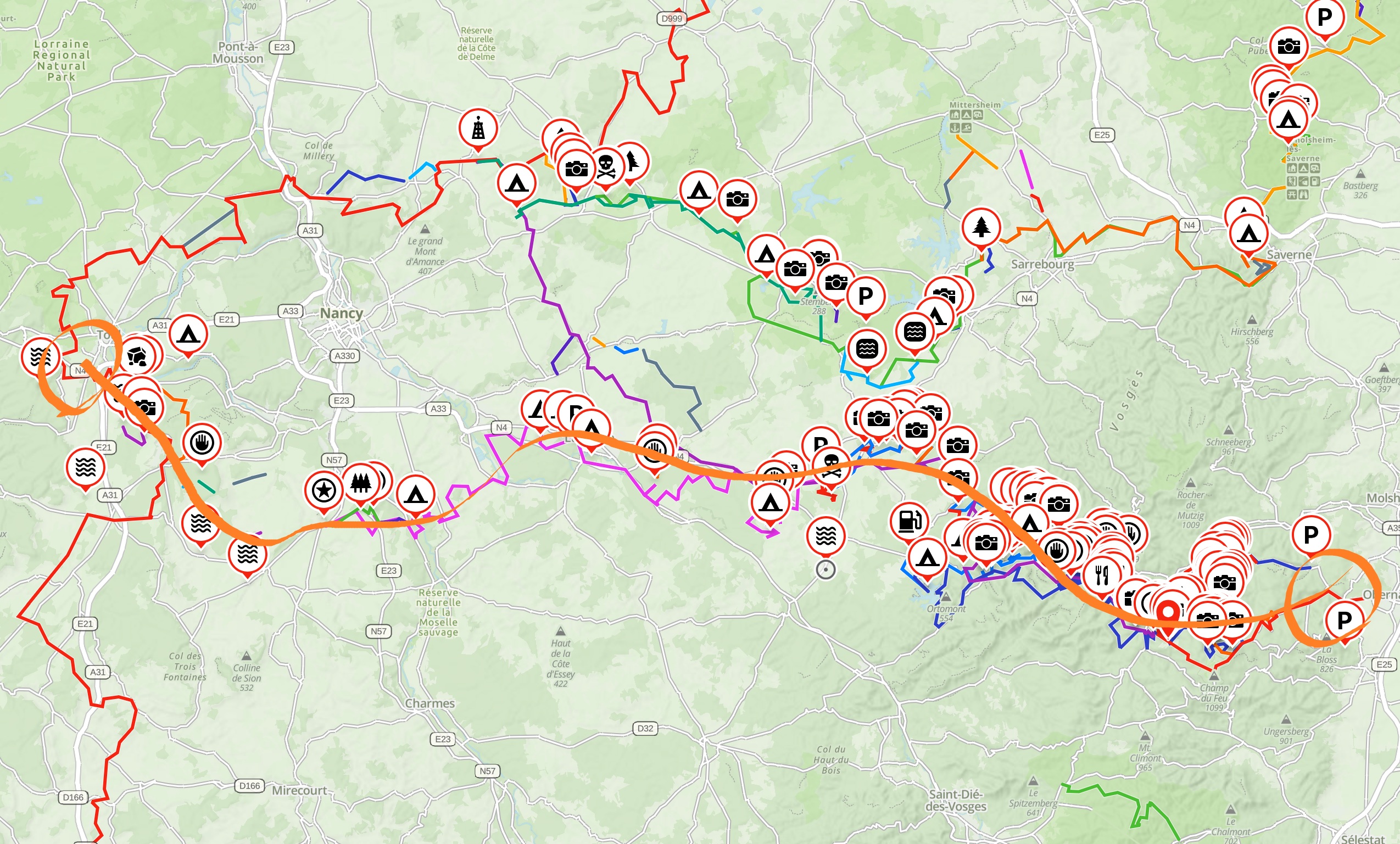 Start bei Straßburg, Ende in der Umgebung von Nancy. Die Route verläuft über die Höhenzüge der Vogesen und durch das französische Hinterland. Anpassung je nach Wetterbedingungen.